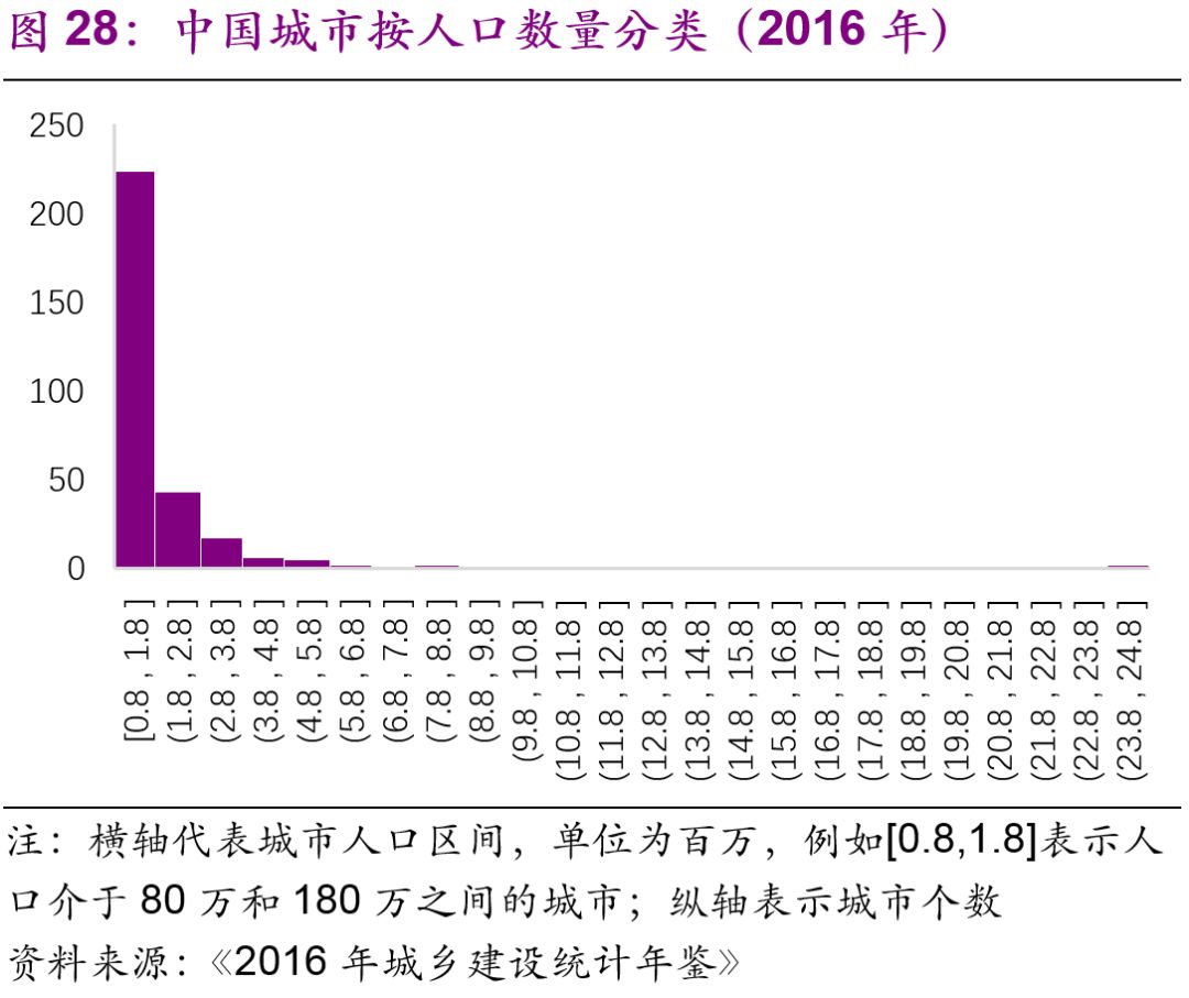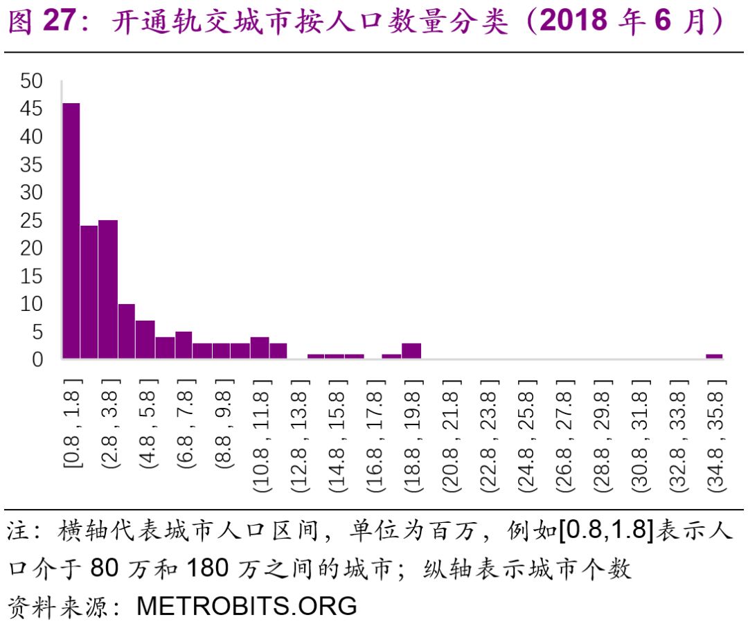 擬建地鐵、輕軌線路初期客運強度分別不低于每日每公里0.7萬人次、0.4萬人次,遠(yuǎn)期客流規(guī)模分別達(dá)到單向高峰小時3萬人次以上、1萬人次以上。但是同時也強調(diào)了:“以上申報條件將根據(jù)經(jīng)濟社會發(fā)展情況按程序適時調(diào)整。”2016年,中國城市中市區(qū)常住人口在150萬以上的城市共有111個,對比目前已經(jīng)開通軌道交通的城市數(shù)量(34個),仍有一定的發(fā)展空間。而從國際上看,建設(shè)軌道交通的城市人口的起點[19]大約為100萬(圖27),如果長期內(nèi)中國將建設(shè)軌道交通的人口標(biāo)準(zhǔn)下調(diào)至100萬,那么將有225個城市符合標(biāo)準(zhǔn)(圖28)。