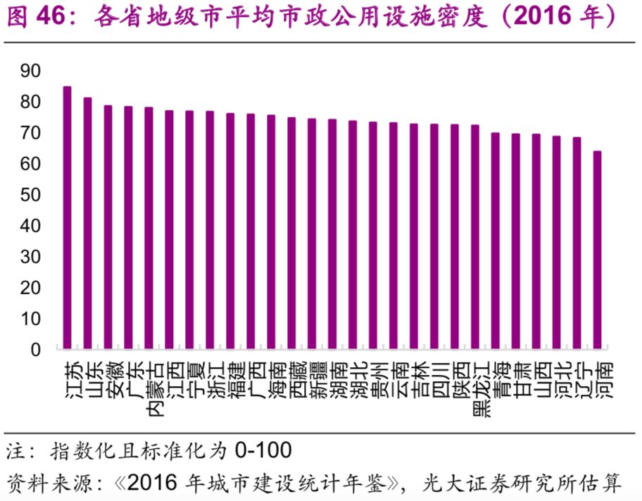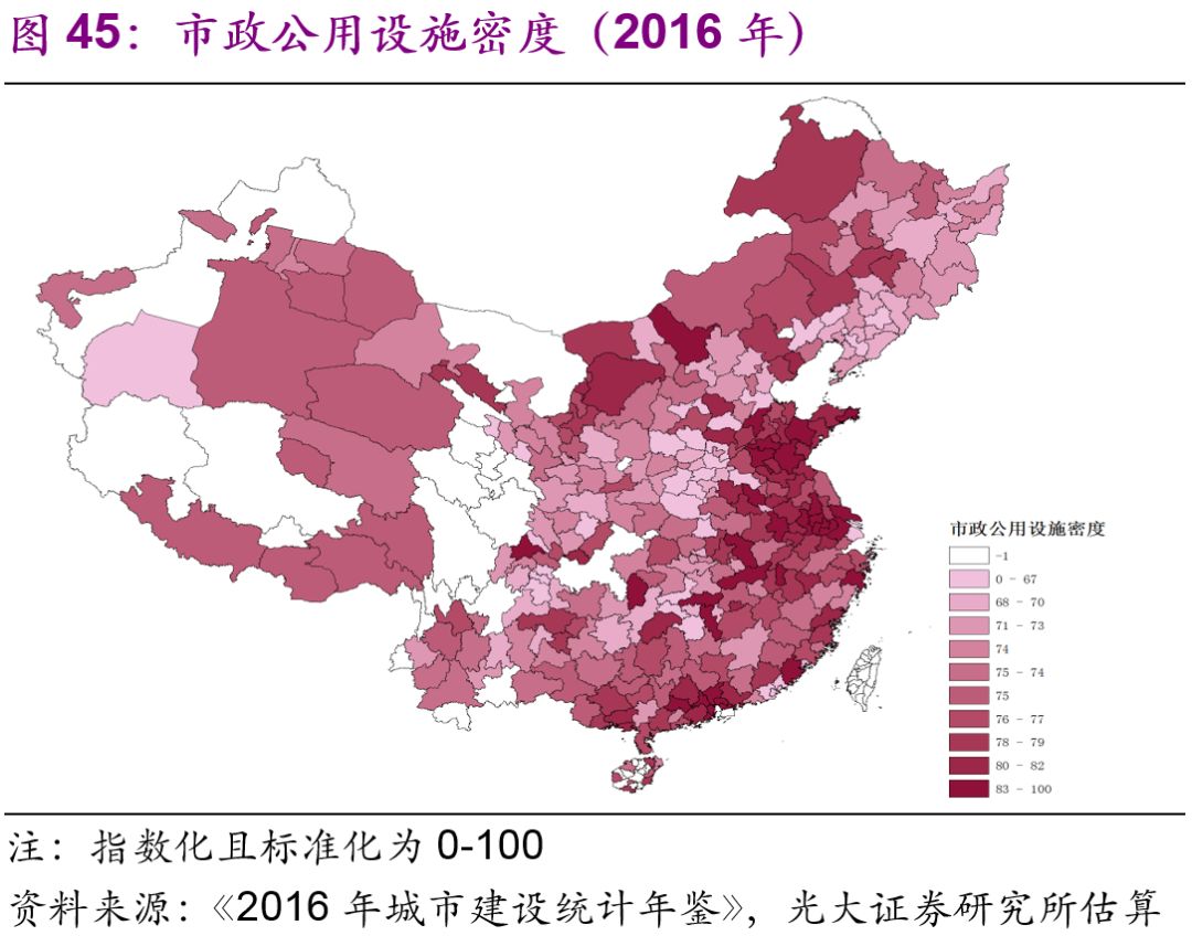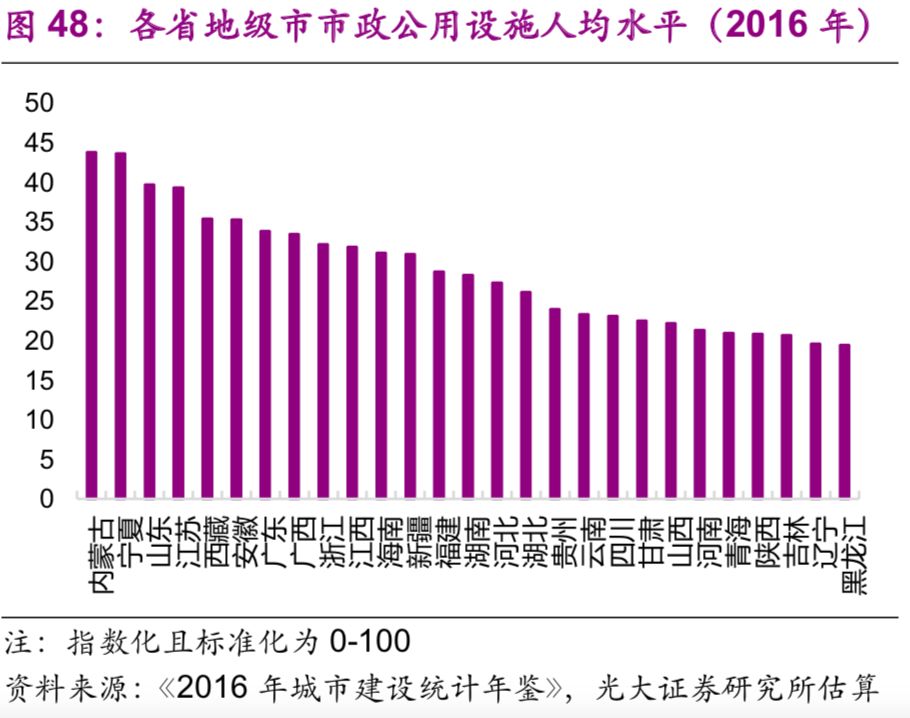 城市市政公用設(shè)施投資結(jié)構(gòu)不斷變化。隨著中國城鎮(zhèn)化的不斷推進,2016年投資額達(dá)1.7萬億元的城市市政公用設(shè)施投資結(jié)構(gòu)有了較大變化:1990年占據(jù)較大比重的燃?xì)猓?6%)、供水(20%)隨著滲透率觸及“天花板[26]”后比重下降較快,兩者2016年的比重分別為2%、3%;而更能體現(xiàn)城市功能升級的公共交通、道路橋梁等的比重上升較快,1990年兩者的比重分別為8%、26%,2016年則分別為23%、43%;此外,許多新型的城市市政公用設(shè)施投資開始出現(xiàn),例如地下綜合管廊,2016年占比達(dá)到了1.7%(圖44)。