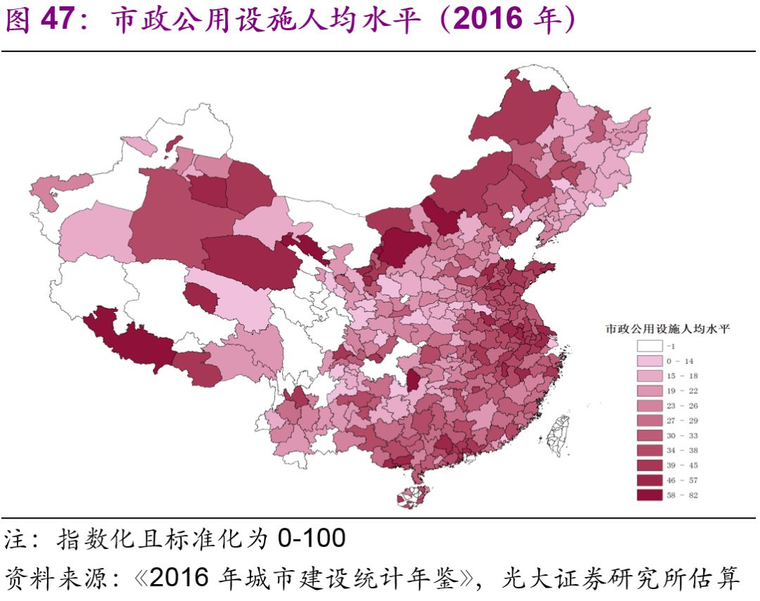 東部和部分西部城市的市政公用設(shè)施水平較高。為了綜合分析各個城市的市政公用設(shè)施水平,我們使用主成份分析法,選取人均日生活用水量、人均道路面積、人均公園綠地面積,對2016年中國各城市得出了綜合的城市市政公用設(shè)施的總量[27]、密度(圖45-46)和人均水平(圖47-48)進行了比較。無論從總量、密度還是人均水平上來看,東部和部分西部城市都比較高,反而是一些中部和東北部城市的城市市政公用設(shè)施水平處于全國比較落后的狀態(tài)。